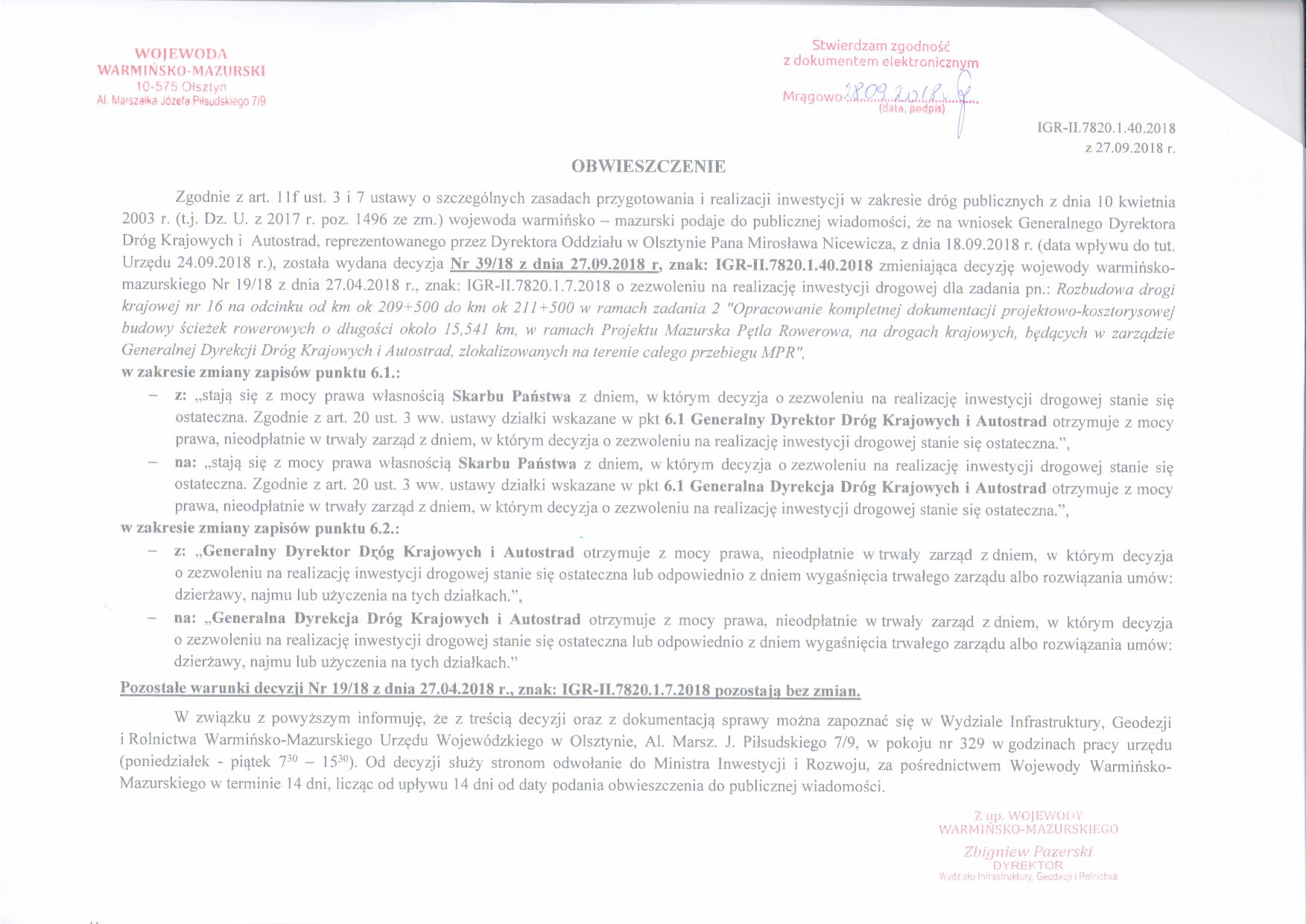 Obwieszczenie Wojewody Warmińsko-Mazurskiego znak: IGR-II.7820.1.40.2018 zadanie pn.: Rozbudowa drogi krajowej nr 16 na odcinku od km ok 209+500 do km ok 211+500 w ramach zadania 2 "Opracowanie kompletnej dokumentacji projektowo-kosztorysowej budowy ścieżek rowerowych o długości około 15,541 km, w ramach projektu Mazurska Pętla Rowerowa, na drogach krajowych, będących w zarządzie Generalnej Dyrekcji Dróg Krajowych i Autostrad, zlokalizowanych na terenie całego przebiegu MPR".