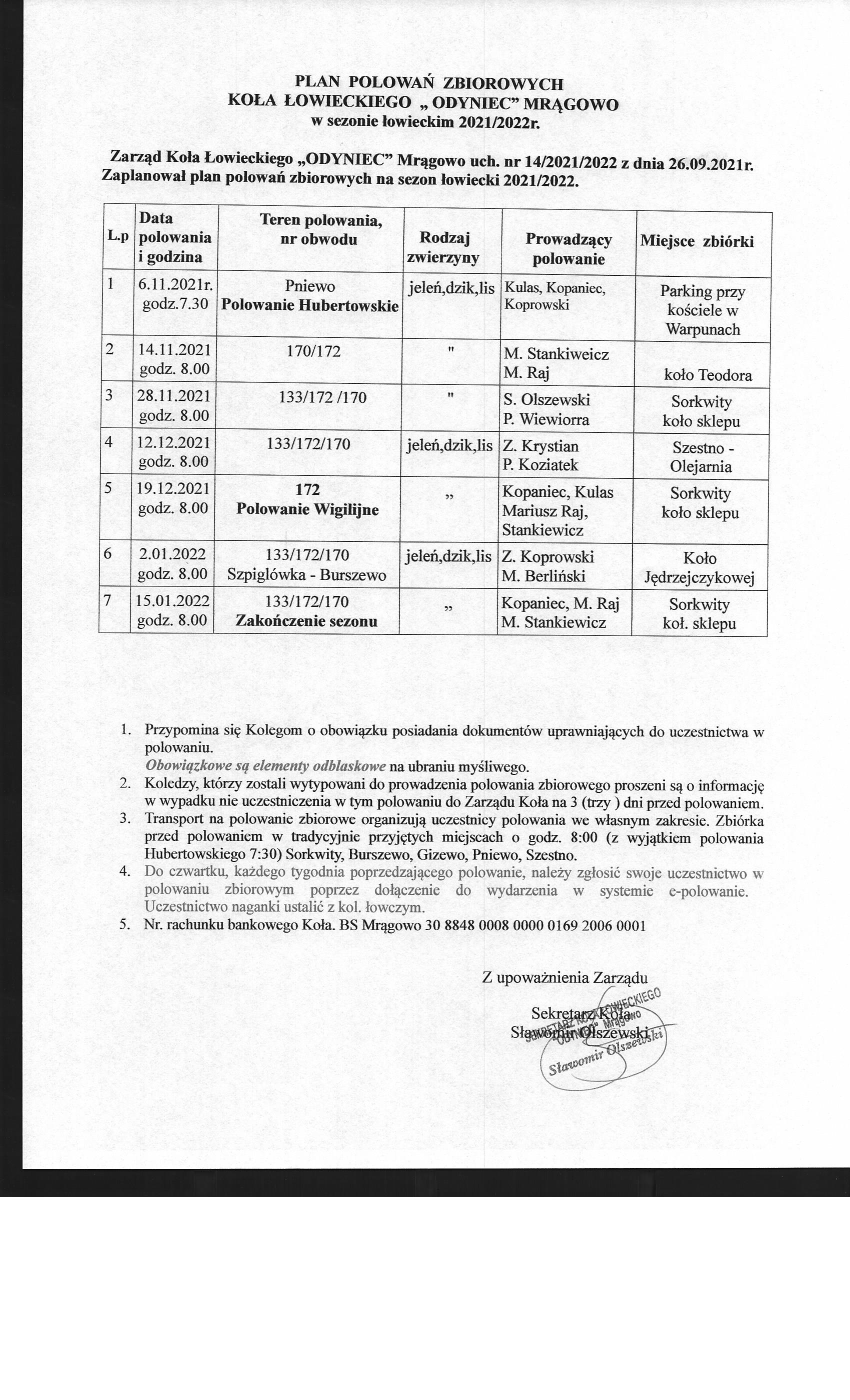 Wersja obowiązująca z dnia 26-10-2021 12:49:43 Drukuj Plan polowań zbiorowych KŁ Odyniec Mrągowo w sezonie łowieckim 2021/2022 Plan dostępny jest w załączniku. Załączniki plan format: image/jpeg, rozmiar: 641.86 KB, data dodania: 26-10-2021 12:49:43