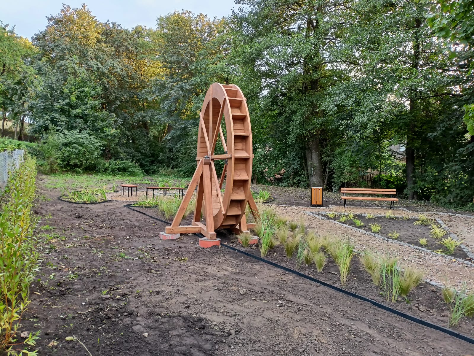 Zadanie polegało na przekształceniu nieużytkowanej działki, znajdującej się w centralnej części miejscowości, w nową przestrzeń publiczną o wysokich walorach estetycznych. W ramach zagospodarowania wyrównano i uporządkowano teren, zasiano nowy trawnik, powstały ścieżki z obrzeżami z kostki granitowej i z wykorzystaniem kamienia naturalnego. Wykonano nasadzenia nawiązujące do specjalizacji tematycznej wsi „wierzbowa wieś” oraz zainstalowano elementy małej architektury takie jak: ławki, kosze na śmieci, tablice informacyjne, drewnianą barierkę, stojak na rowery, ruszt nad ognisko i drewniane koło młyńskie. Koło młyńskie o średnicy ok. 3 metrów jest główną atrakcją nowej przestrzeni i ma na celu nawiązywać do historii miejsca, w którym jest posadowione. Jeszcze kilkadziesiąt lat temu na wysokości zagospodarowywanej działki górował młyn, po którym pozostały jedynie archiwalne fotografie i wspomnienia mieszkańców Wierzbowa.