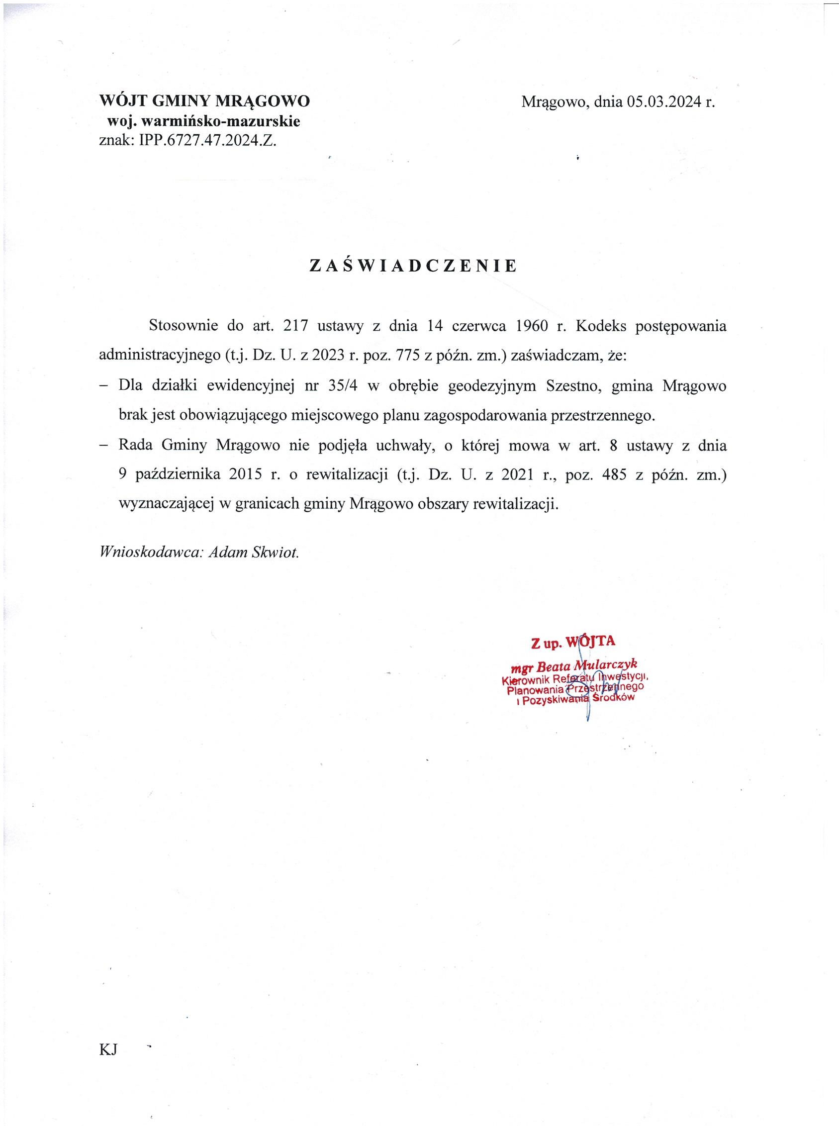 - Decyzja Wójta Gminy Mrągowo znak RBK_7624_3_24_2009