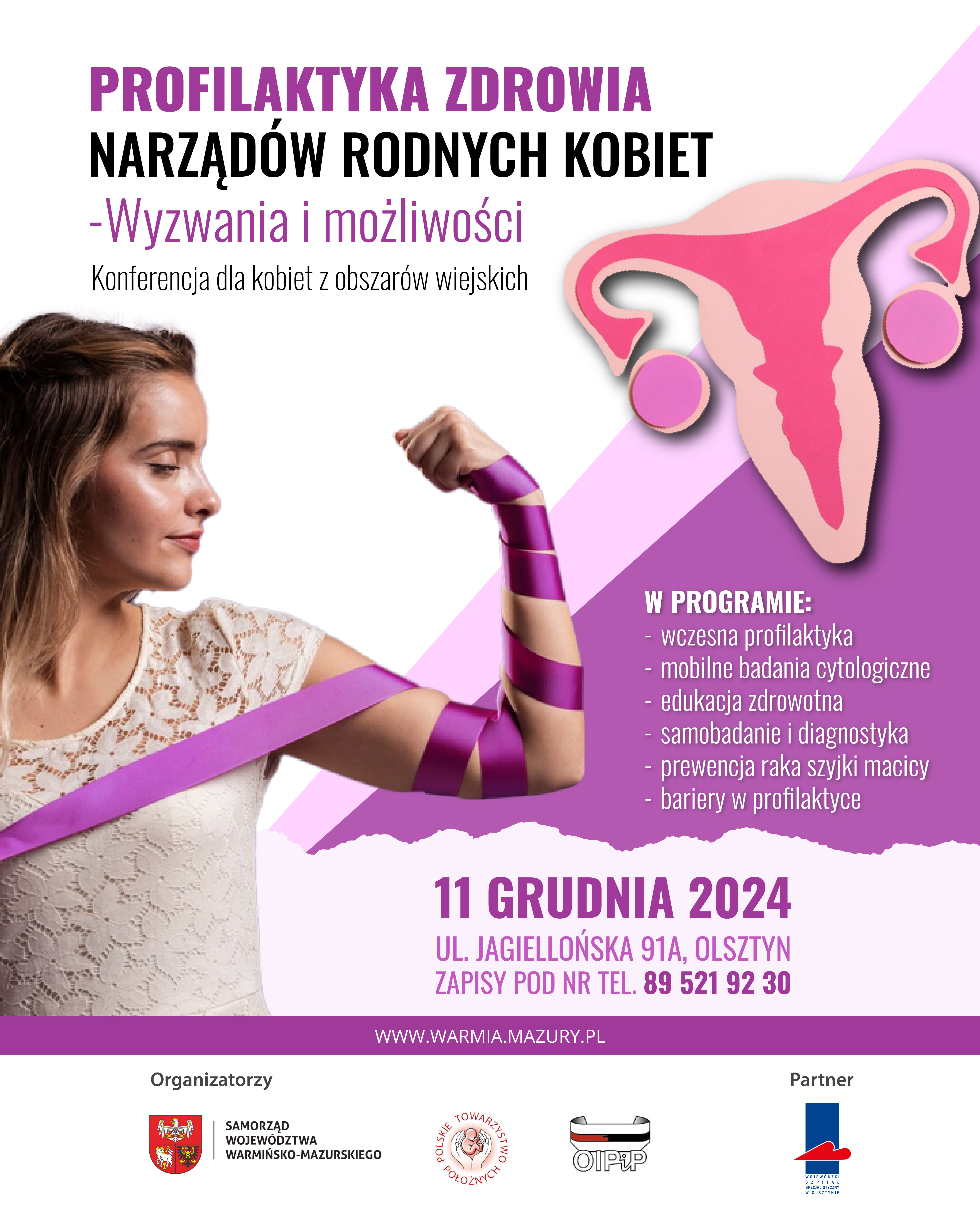 uprzejmie informuję, że Samorząd Województwa Warmińsko-Mazurskiego w dniu 11 grudnia 2024 roku w siedzibie Departamentu Rozwoju Obszarów Wiejskich i Rolnictwa przy ulicy Jagiellońskiej 91a w Olsztynie organizuje konferencję dla kobiet na temat profilaktyki zdrowia narządów rodnych.