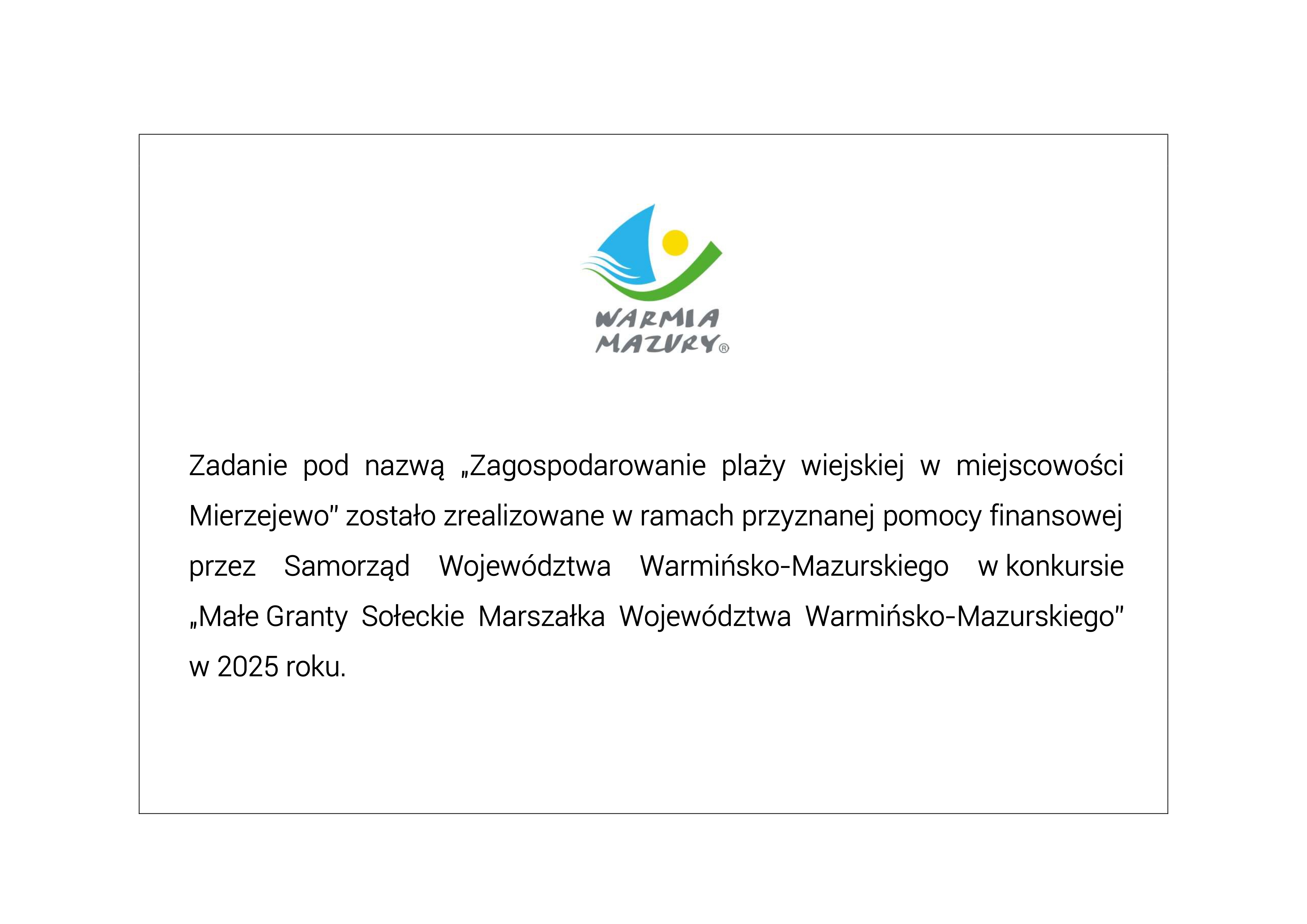Zagospodarowanie plaży wiejskiej w miejscowości Mierzejewo w ramach konkursu „Małe Granty Sołeckie Marszałka Województwa Warmińsko-Mazurskiego” w 2025 roku.
