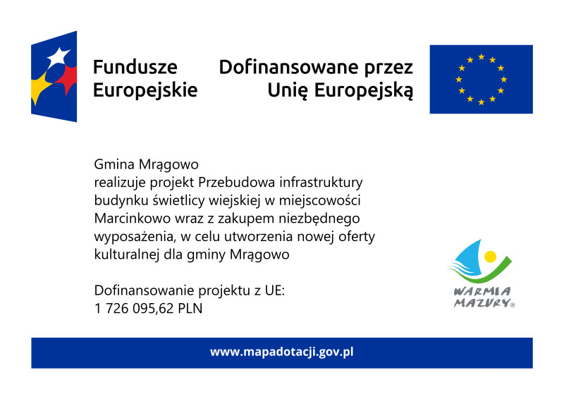 Wniosek złożony na projekt „Przebudowa infrastruktury budynku świetlicy wiejskiej w miejscowości Marcinkowo wraz z zakupem niezbędnego wyposażenia, w celu utworzenia nowej oferty kulturalnej dla gminy Mrągowo” został pozytywnie rozpatrzony, dzięki czemu Gmina Mrągowo na inwestycje pozyskała dofinansowanie w kwocie: 1.726.095,62 zł, co stanowi 85% wartości wydatków kwalifikowalnych. Umowa o dofinansowanie projektu nr FEWM.11.01-IZ.00-0003/24-00 zawarta została dnia 28.03.2025 r. pomiędzy przedstawicielami Zarządu Województwa Warmińsko-Mazurskiego, a Gminą Mrągowo.