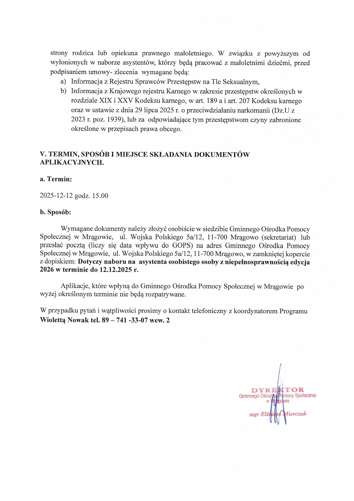 Wymagane dokumenty należy złożyć osobiście w siedzibie Gminnego Ośrodka Pomocy Społecznej w Mrągowie, ul. Wojska Polskiego 5a/12, 11-700 Mrągowo (sekretariat) lub przesłać pocztą (liczy się data wpływu do GOPS) na adres Gminnego Ośrodka Pomocy Społecznej w Mrągowie, ul. Wojska Polskiego 5a/12, 11-700 Mrągowo, w zamkniętej kopercie z dopiskiem: Dotyczy naboru na asystenta osobistego osoby z niepełnosprawnością edycja 2026 w terminie do 12.12.2025 r.