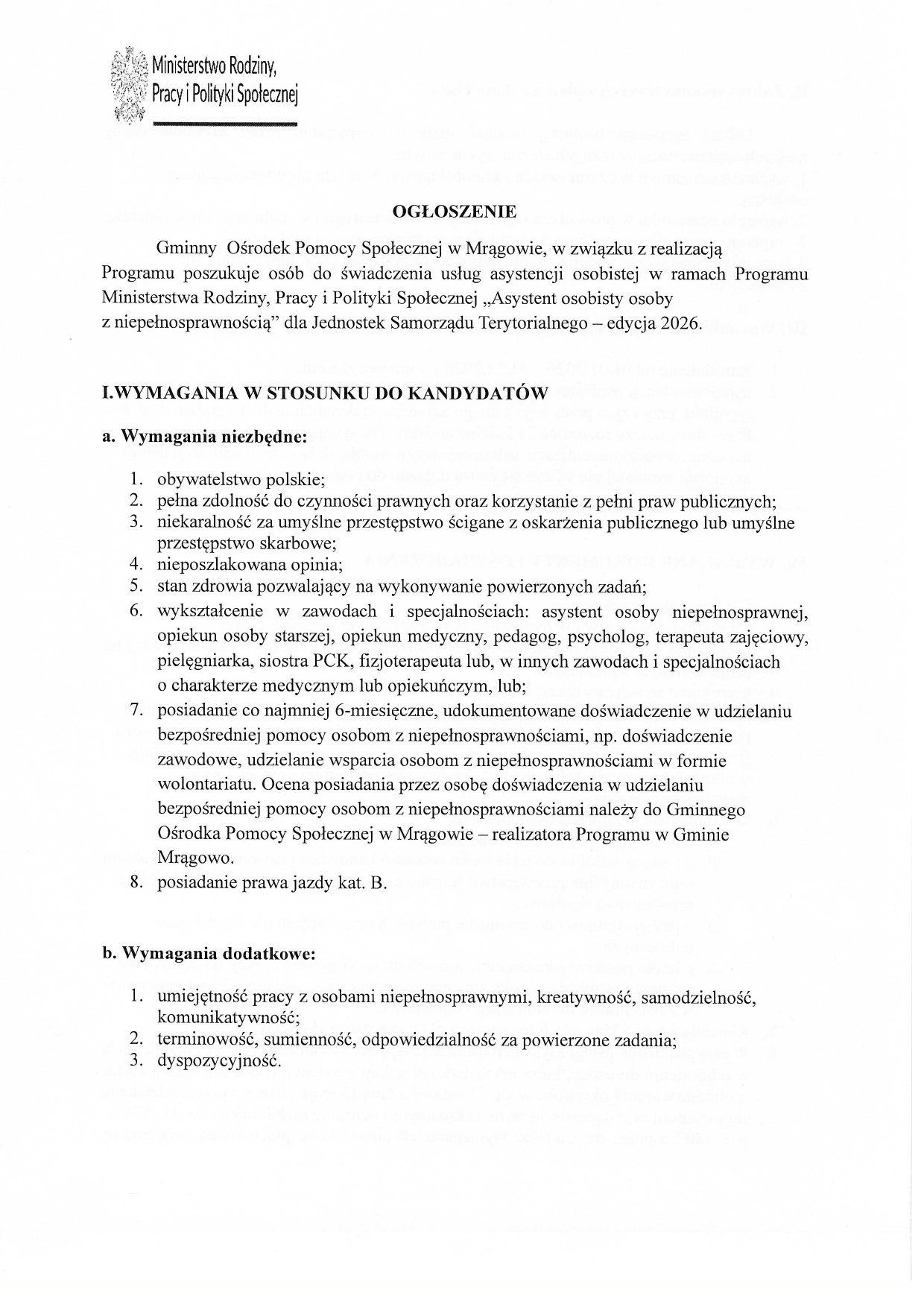 7. posiadanie co najmniej 6-miesięczne, udokumentowane doświadczenie w udzielaniu bezpośredniej pomocy osobom z niepełnosprawnościami, np. doświadczenie zawodowe, udzielanie wsparcia osobom z niepełnosprawnościami w formie wolontariatu. Ocena posiadania przez osobę doświadczenia w udzielaniu bezpośredniej pomocy osobom z niepełnosprawnościami należy do Gminnego Ośrodka Pomocy Społecznej w Mrągowie – realizatora Programu w Gminie Mrągowo.
