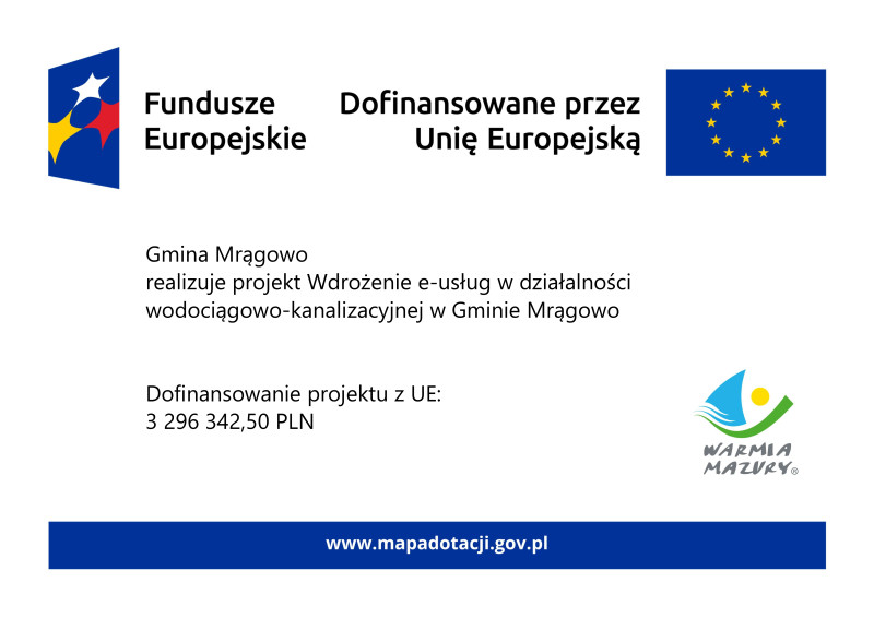 Wniosek złożony na projekt „Wdrożenie e-usług w działalności wodociągowo-kanalizacyjnej w Gminie Mrągowo” został pozytywnie rozpatrzony, dzięki czemu Gmina Mrągowo pozyskała na inwestycję dofinansowanie w kwocie: 3.296.342,50 zł, co stanowi 85% wartości wydatków kwalifikowalnych. Umowa o dofinansowanie projektu nr FEWM.01.06-IZ.00-0036/23-00 zawarta została w dniu 12 września 2024 roku pomiędzy przedstawicielami Zarządu Województwa Warmińsko-Mazurskiego (Instytucja Zarządzająca FEWiM 2021-2027), a Gminą Mrągowo.