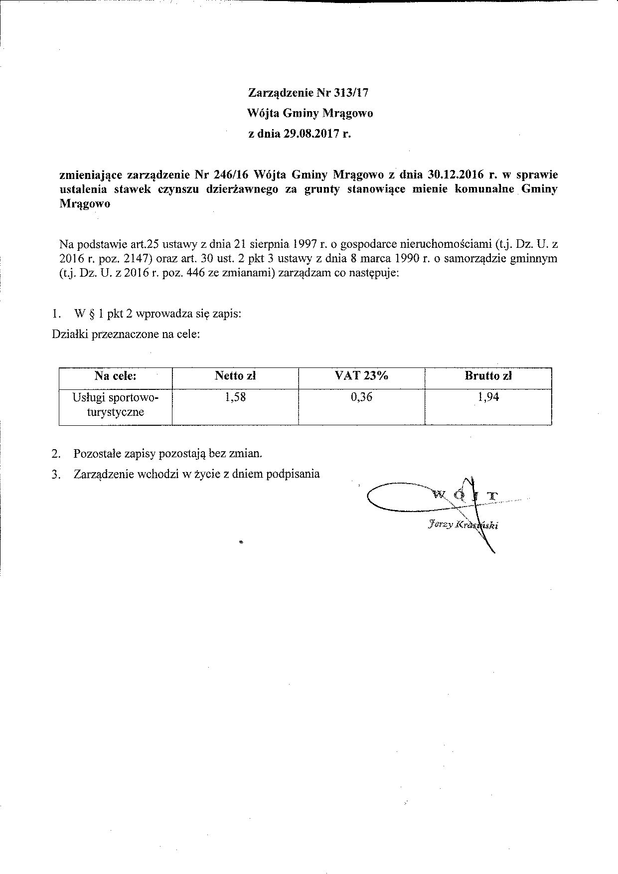 Zarządzenie Nr 313/17 Wójta Gminy Mrągowo z dnia 29.08.2017r., zmieniające zarządzenie Nr 246/16 Wójta Gminy Mrągowo z dnia 30.12.2016r., w sprawie ustalenia stawek czynszu dzierżawnego za grunty stanowiące mienie komunalne Gminy Mrągowo