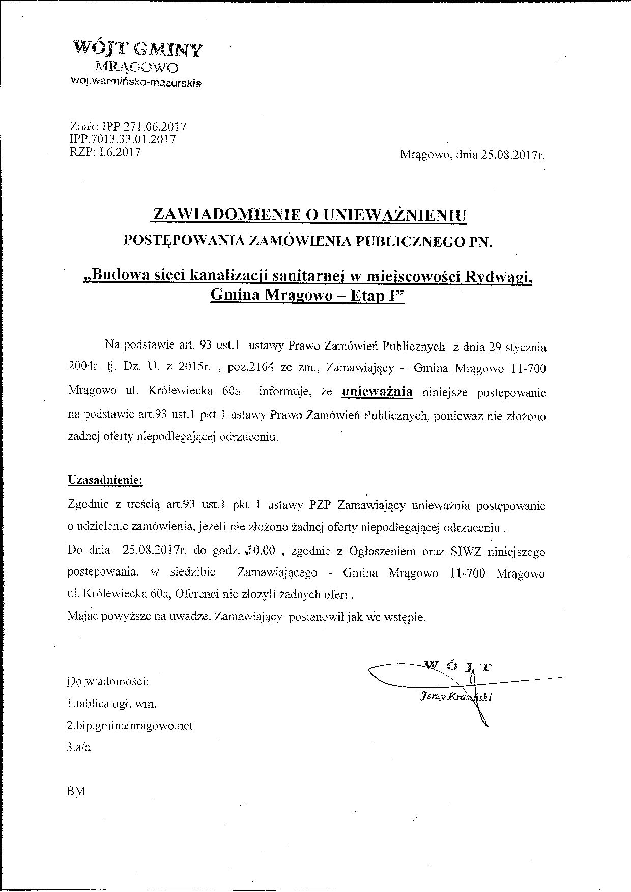 2.1.Wykaz osób ( zał.nr 10), Zamawiający uzna warunek za spełniony, jeżeli Wykonawca przedstawi: 1. Wykaz, osób, które uczestniczyć będą w wykonywaniu zamówienia, w szczególności odpowiedzialnych za świadczenie usług, kontrolę jakości lub kierowanie robotami budowlanymi, wraz z informacjami na temat ich kwalifikacji zawodowych, uprawnień, doświadczenia i wykształcenia niezbędnych do wykonania zamówienia publicznego, a także zakresu wykonywanych przez nie czynności oraz informacją o podstawie do dysponowania tymi osobami, w tym obowiązkowo: Wykaz, co najmniej 3 osób w tym: • Kierownika budowy, osobę posiadającą uprawnienia budowlane do kierowania robotami budowlanymi w specjalności do wykonywania sieci kanalizacji sanitarnej bądź też odpowiadające im ważne uprawnienia budowlane wydane na podstawie wcześniej obowiązujących przepisów umożliwiające wykonywanie funkcji kierownika budowy dla budowy będącej przedmiotem zamówienia. • Kierownika budowy ( w zakresie rozbiórki istniejącej oczyszczalni ścieków w m. Rydwągi- Decyzja Nr 442/2015/Mrw z dnia 30.12.2015r.), osobę posiadającą uprawnienia budowlane bez ograniczeń w specjalności konstrukcyjno-budowlanej bądź też odpowiadające im uprawnienia budowlane wydane na podstawie wcześniej obowiązujących przepisów umożliwiające wykonywanie funkcji kierownika budowy dla budowy będącej przedmiotem zamówienia, • Osobę posiadającą uprawnienia budowlane do kierowania robotami budowlanymi w zakresie sieci, instalacji i urządzeń elektrycznych i elektroenergetycznych, bądź też odpowiadające im uprawnienia budowlane wydane na podstawie wcześniej obowiązujących przepisów umożliwiające wykonywanie funkcji kierownika budowy dla budowy będącej przedmiotem zamówienia, 2.2. Oświadczenie na temat wykształcenia i kwalifikacji zawodowych( Zał. Nr 9), że osoby, które będą uczestniczyć w wykonywaniu zamówienia, posiadają wymagane uprawnienia. 2.3. Informację banku lub spółdzielczej kasy rozliczeniowo-kredytowej potwierdzającej wysokość posiadanych środków finansowych lub zdolność kredytową Wykonawcy w okresie nie wcześniejszym niż 1 miesiąc przed upływem terminu składania ofert dysponowaniem środkami finansowymi lub zdolnością kredytową w wysokości nie mniejszej niż 650.000 zł. 2.4. Dokument potwierdzający, że wykonawca jest ubezpieczony od odpowiedzialności cywilnej w zakresie prowadzonej działalności związanej z przedmiotem zamówienia na sumę gwarancyjną nie mniejszą niż 650.000 zł. 2.5. Wykaz robót (zał. nr 7) - Wykonawca wykaże, iż w okresie ostatnich 5 lat przed upływem terminu składania ofert, a jeżeli okres prowadzenia działalności jest krótszy – w tym okresie, wykonał co najmniej jedną robotę budowlaną odpowiadającą swoim rodzajem i wartością robotom stanowiącym przedmiot zamówienia tj. wybudował sieć kanalizacji sanitarnej o wartości co najmniej 650.000 zł brutto , wraz z podaniem ich rodzaju, wartości, daty, miejsca wykonania i podmiotów, na rzecz których roboty te zostały wykonane, z załączeniem dowodów określających, czy te roboty budowlane zostały wykonane należycie, w szczególności informacji o tym, czy roboty zostały wykonane zgodnie z przepisami prawa budowlanego i prawidłowo ukończone, przy czym dowodami , o których mowa, są referencje bądź inne dokumenty wystawione przez p0odmiot , na rzecz którego roboty budowlane były wykonane, a jeżeli z uzasadnionej przyczyny o obiektywnym charakterze wykonawca nie jest w stanie uzyskać tych dokumentów-inne dokumenty. 3. Jeżeli z uzasadnionej przyczyny wykonawca nie może złożyć wymaganych przez zamawiającego dokumentów, o których mowa w pkt. 2. ppkt 2.4. , 2.5., zamawiający dopuszcza złożenie przez Wykonawcę innych dokumentów, które w wystarczający sposób potwierdzą spełnienie opisanego przez zamawiającego warunku udziału w postępowaniu. 4. Jeżeli z uzasadnionej przyczyny wykonawca nie może złożyć wymaganych przez zamawiającego dokumentów, o których mowa w pkt. 2.ppkt 2.5., zamawiający dopuszcza złożenie przez Wykonawcę innych odpowiednich dokumentów w celu potwierdzenia spełnienia warunków udziału w postępowaniu, 5. W przypadku Wykonawców wspólnie ubiegających się o udzielenie zamówienia dokumenty wymienione w pkt. 2 składa każdy z Wykonawców wspólnie ubiegających się o udzielenie zamówienia, 6. W przypadku wykonawcy, który polega na zdolnościach lub sytuacji innych podmiotów na zasadach określonych w art 22a ustawy, dokumenty wymienione w pkt. 2 przedmiotowy dokument należy złożyć także w odniesieniu do tych podmiotów, 7.W przypadku wskazania przez Wykonawcę (w formie odrębnego oświadczenia) dostępności oświadczeń lub dokumentów wymienionych w pkt.2, w formie elektronicznej pod określonymi adresami internetowymi ogólnodostępnych i bezpłatnych baz danych, Zamawiający pobierze samodzielnie z tych baz danych wskazane przez Wykonawcę oświadczenia lub dokumenty. 8.W przypadku wskazania przez Wykonawcę (w formie odrębnego oświadczenia zawierającego min. sygnatury postępowań, w którym wymagane dokumenty lub oświadczenia były składane) dostępności oświadczeń lub dokumentów wymienionych w pkt. 2, które znajdują się w posiadaniu Zamawiającego, w szczególności oświadczeń lub dokumentów przechowywanych przez Zamawiającego zgodnie z art. 97 ust. 1 ustawy, Zamawiający w celu potwierdzenia okoliczności , o których mowa w art. 25 ust. 1 pkt. 1 i 3 ustawy, korzysta z posiadanych oświadczeń lub dokumentów, o ile są one aktualne.