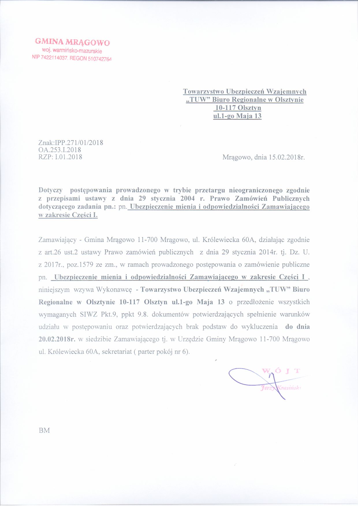 Gmina Mrągowo: Ubezpieczenie mienia i odpowiedzialności Zamawiającego w zakresie: Część I Zamówienia: Ubezpieczenie mienia i odpowiedzialności Zamawiającego w zakresie: Ubezpieczenie mienia od ognia i innych zdarzeń losowych, Ubezpieczenie mienia od kradzieży z włamaniem i rabunku oraz od kradzieży zwykłej, Ubezpieczenie sprzętu elektronicznego od wszystkich ryzyk, Ubezpieczenie odpowiedzialności cywilnej, Ubezpieczenie szyb od stłuczenia, Ubezpieczenie następstw nieszczęśliwych wypadków, Ubezpieczenie maszyn od uszkodzeń od wszystkich ryzyk. Część II Zamówienia: Ubezpieczenie pojazdów Zamawiającego w zakresie: Ubezpieczenie odpowiedzialności cywilnej posiadaczy pojazdów mechanicznych, Ubezpieczenie autocasco, Ubezpieczenie następstw nieszczęśliwych wypadków kierowcy i pasażerów, ..